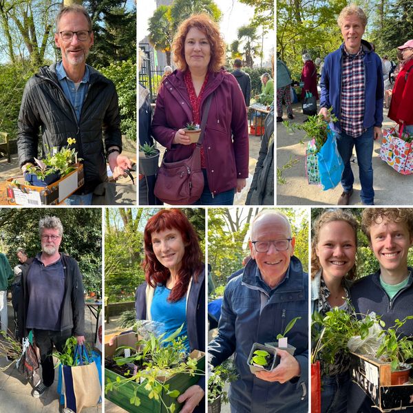 Na afloop fotografeerden we dan ook heel veel blije tuinliefhebbers met hun nieuwe aanwinsten: kamerplanten en heel veel tuinplanten.  Het tijdschema is elke keer hetzelfde: vanaf 10 uur leveren de plantenliefhebbers hun overtollige stekjes en potjes in. De vrijwilligers van Groei & Bloei Delft voorzien ze van namen en stallen de planten uit, en vanaf half 11 mag ieder de planten van zijn of haar gading uitzoeken en meenemen. Om 11 uur is het alweer klaar.